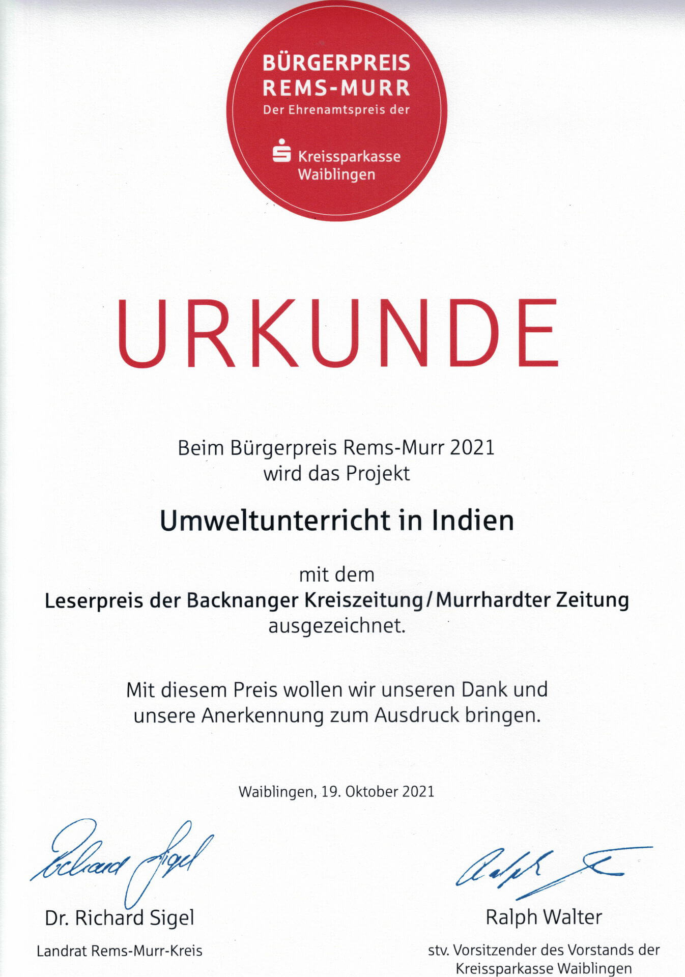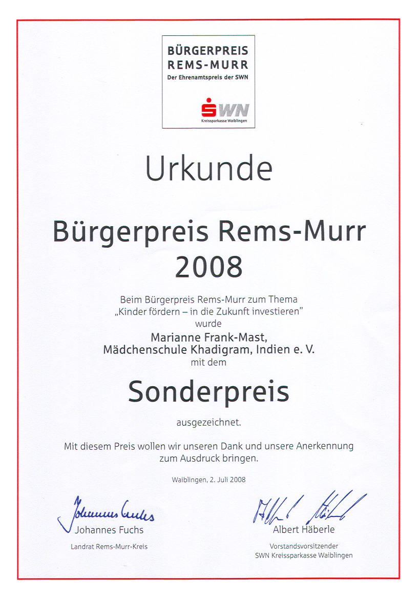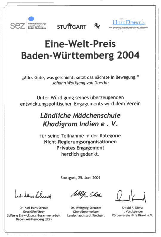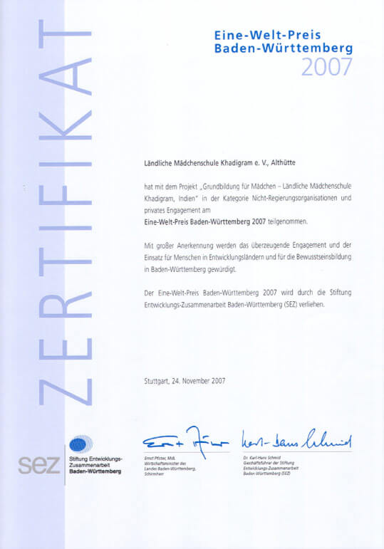 Diese Urkunden wurden dem Verein Mädchenschule Khadigram e.V. für überzeugendes entwicklungspolitisches Engagement durch die Stiftung Entwicklungs-Zusammenarbeit Baden-Württemberg gemeinsam mit der Landeshauptstadt Stuttgart und dem Förderverein Hilfe Direkt e.V. verliehen: